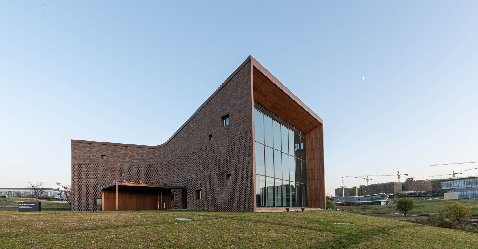建筑南側(cè)設(shè)置次要出入口,并與水流形成互動。建筑立面材質(zhì)采用精致的磚材拼面,屋頂采用微微揚起的處理手法;穩(wěn)重且不失變化。