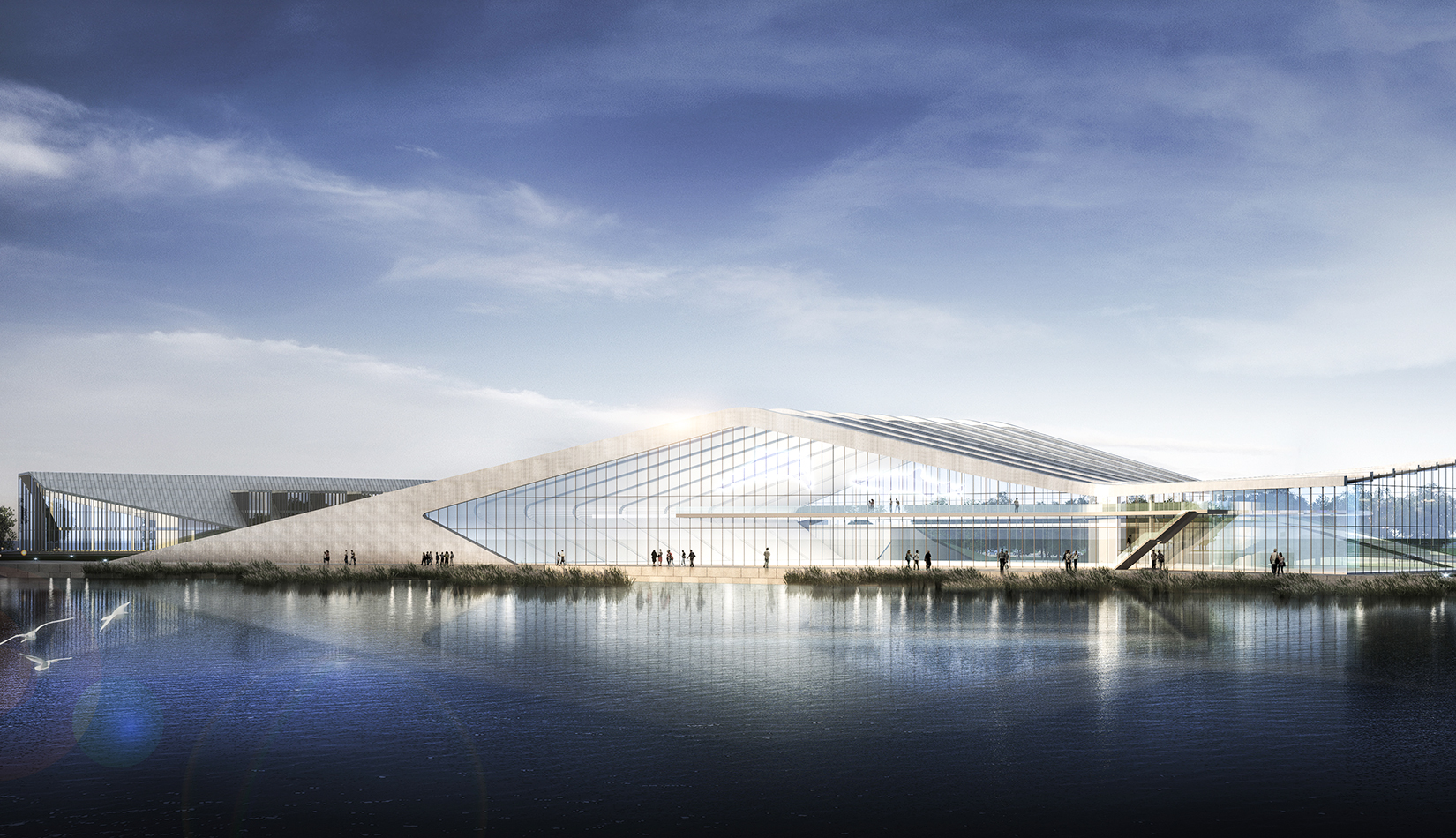海洋科技館坐落在中科院青島科教園沿海區(qū)的中心地帶,沿海岸線呈一字型布局。方案設(shè)計以浪花和貝殼為意象,建筑像從場地中生長出來,擁有著與海浪一樣流暢的外形,在與基址和諧相融的同時,也呼應(yīng)著青島的城市文化和人文關(guān)系。大跨度鋼結(jié)構(gòu)結(jié)構(gòu)排架為大空間的開放展示提供了可能,同時營造了無間斷的觀海空間??萍拣^外墻以玻璃幕墻為主,保證了觀海景觀通透性。