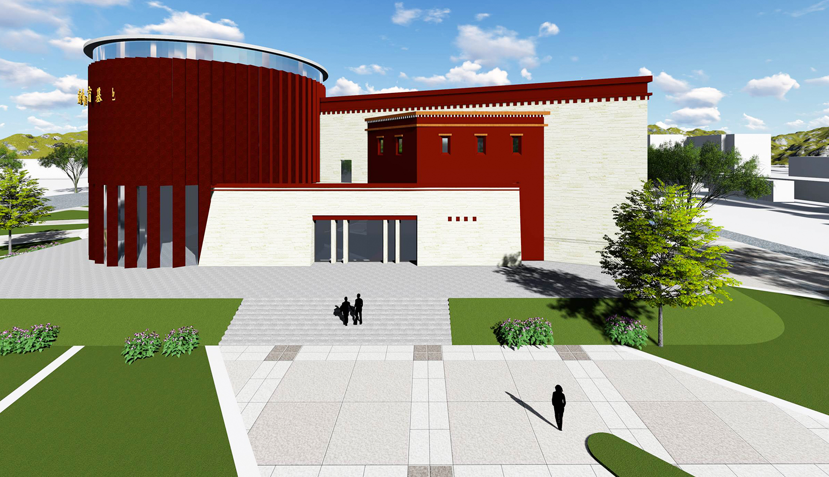 設(shè)計造型整體為中心聚攏的形態(tài),圓形體塊是建筑的核心,象征著黨的領(lǐng)導(dǎo),各分支體塊象征著分布在果洛的各個民族,體現(xiàn)出各民族團結(jié)一心,同心向黨,在黨的領(lǐng)導(dǎo)下團結(jié)一致、共同奮斗;另一方面,圓形體塊與各分支體塊的簇?fù)黻P(guān)系也象征著各民族緊密團結(jié),永不分離。