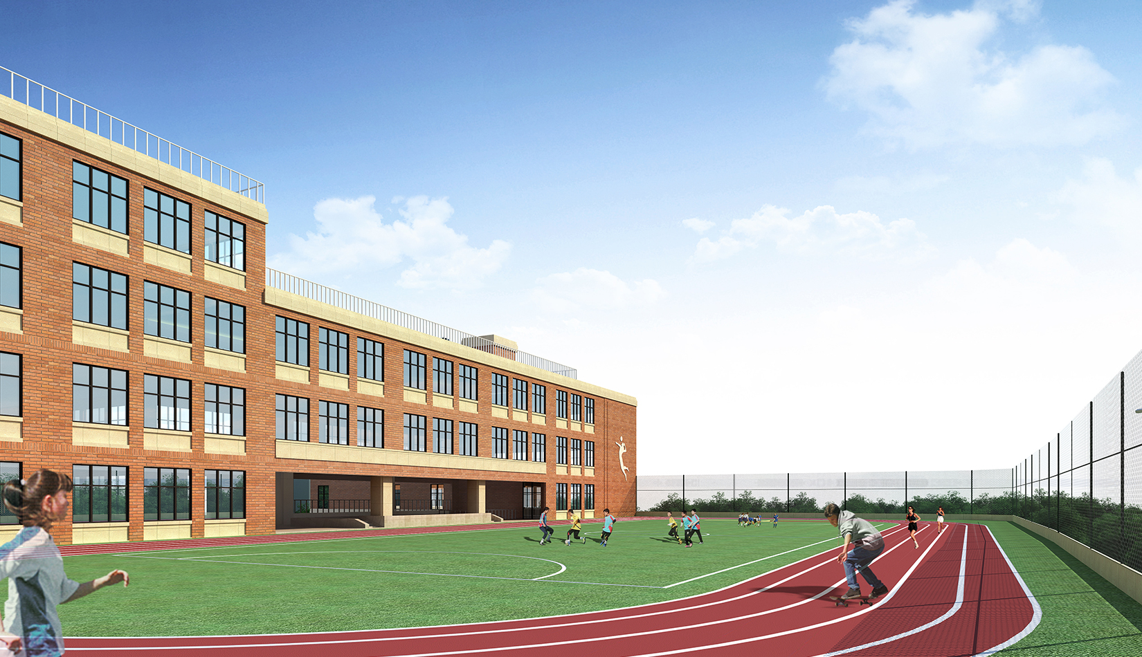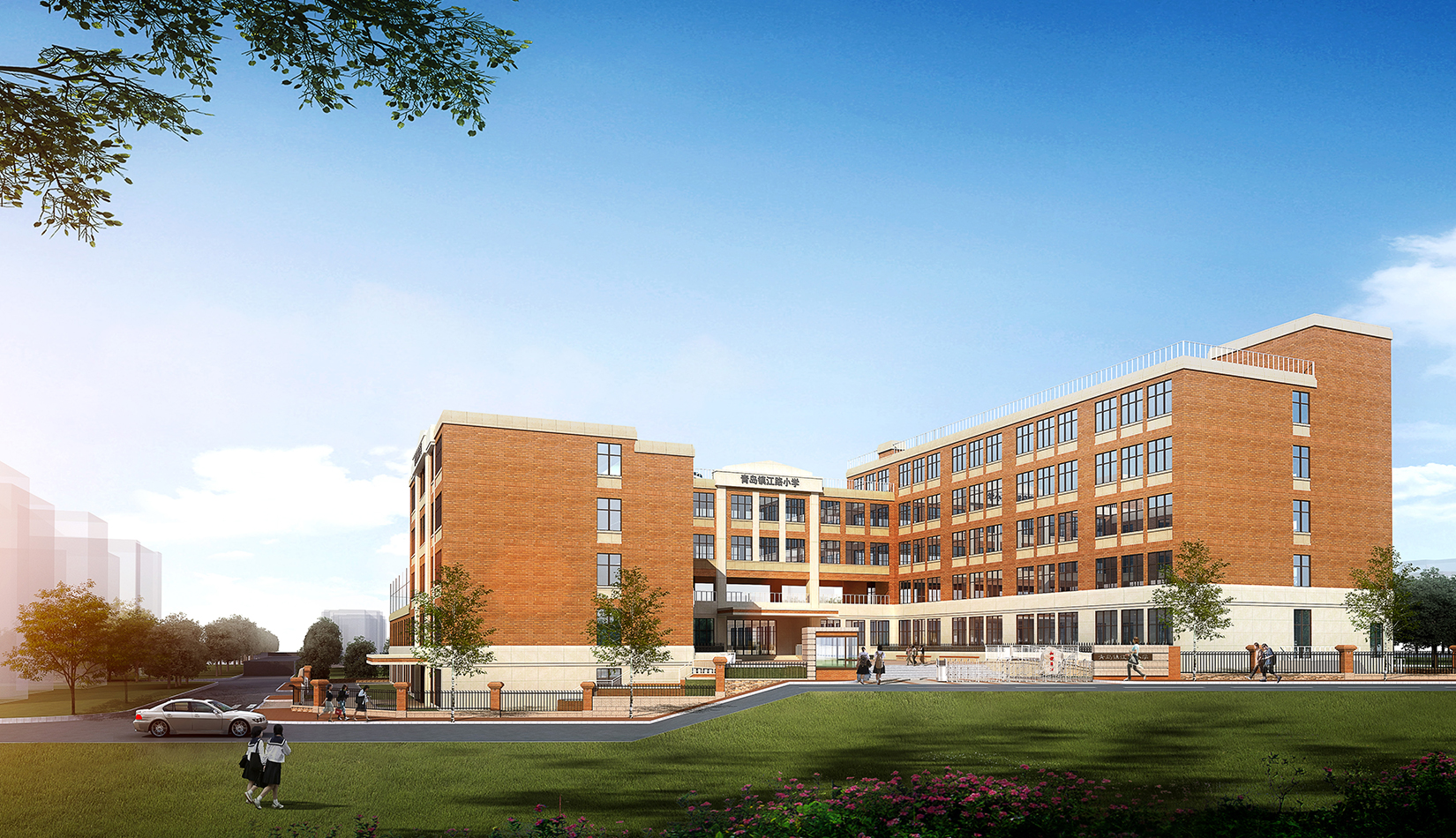 該項(xiàng)目的設(shè)計(jì)延續(xù)區(qū)域肌理,與區(qū)域城市肌理相融合,提高區(qū)域環(huán)境。立面設(shè)計(jì)考慮市南區(qū)及鎮(zhèn)江路原有學(xué)校風(fēng)格,采用學(xué)院派建筑風(fēng)格,塑造古典人文氛圍,校園墻體通過(guò)磚的變化設(shè)計(jì)文化墻,將文化傳承與精神傳承融合在建筑之中。根據(jù)地勢(shì)和日照進(jìn)行功能布局排列,下沉庭院、連廊和架空設(shè)計(jì)的鄰近操場(chǎng)的校園環(huán)境設(shè)計(jì),一方面塑造了豐富多彩的校園環(huán)境,另一方面充分保證了室內(nèi)環(huán)境的采光,讓孩子們更多地享受陽(yáng)光。